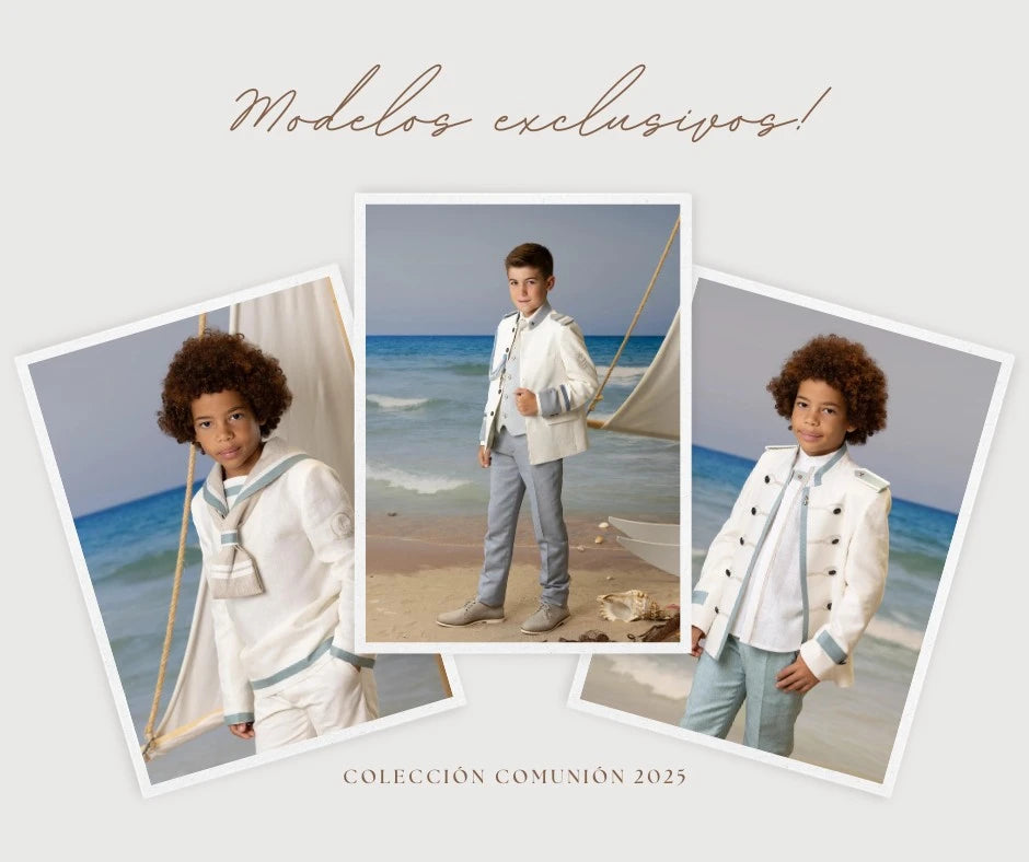 Descubre la nueva colección para 2025. Más de 45 modelos a elegir y sección outlet. Diversidad de modelos para niño desde marineros de estilo casual, almirantes con chaqueta abierta, almirantes con chaleco y corbata, trajes de calle con acabado a elegir. Amplia opción de tejidos y colorido. Destacamos por la elección de combinación de colores y acabado en los trajes de calle. Trabajamos amplio tallaje desde la talla 5 a la 24 en todos los modelos y tallaje especial. ¡No dejes de visitarnos y concierta tu cita!