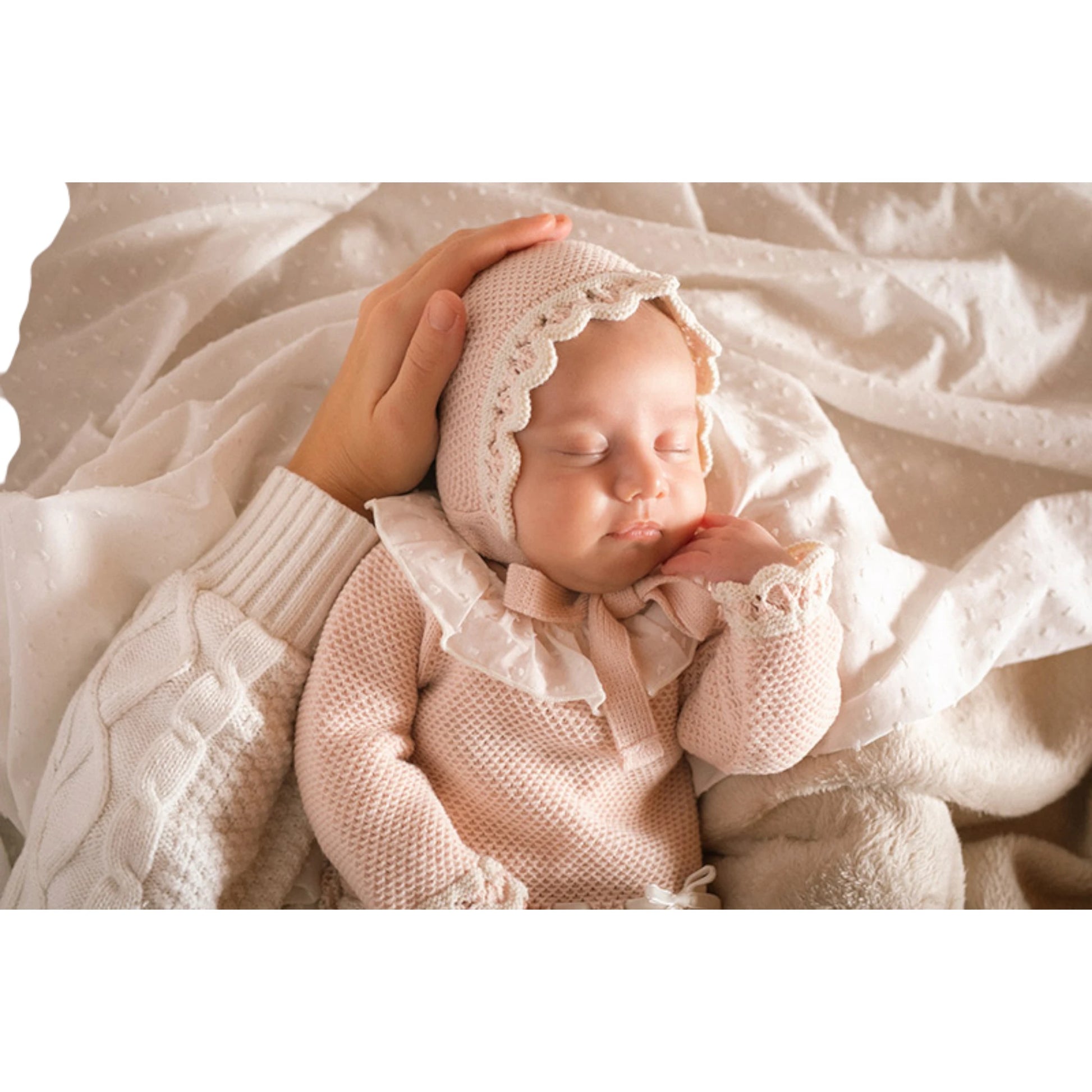 Este conjunto compuesto de jersey, polaina y capota es perfecto como primera puesta por su comodidad para vestir a tu bebé en sus primeros días, además su acabado tan dulce hace que sea un conjunto ideal para un día tan especial