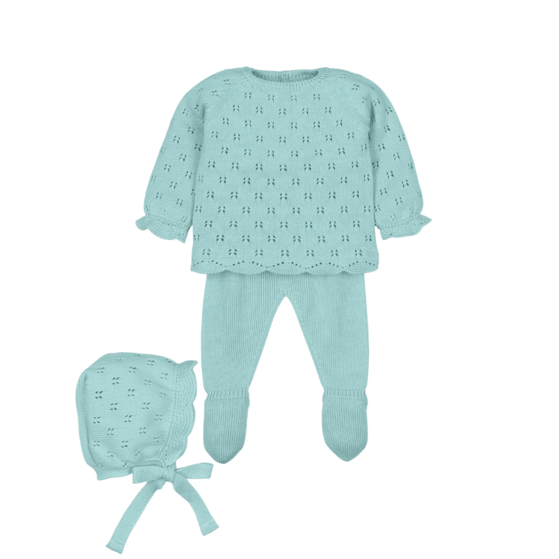 Este conjunto para bebé de tres piezas, está compuesto por jubón, polaina y capota, está confeccionado en suave punto de algodón color verde agua. Presenta un delicado detalle calado y volantes en los puños y capota, aportando un acabado elegante y cómodo. Ideal para los meses intermedios del año, ofrece confort y protección desde la primera puesta hasta los 6 meses. Perfecto para cuidar la piel sensible del bebé con un diseño práctico y delicado.