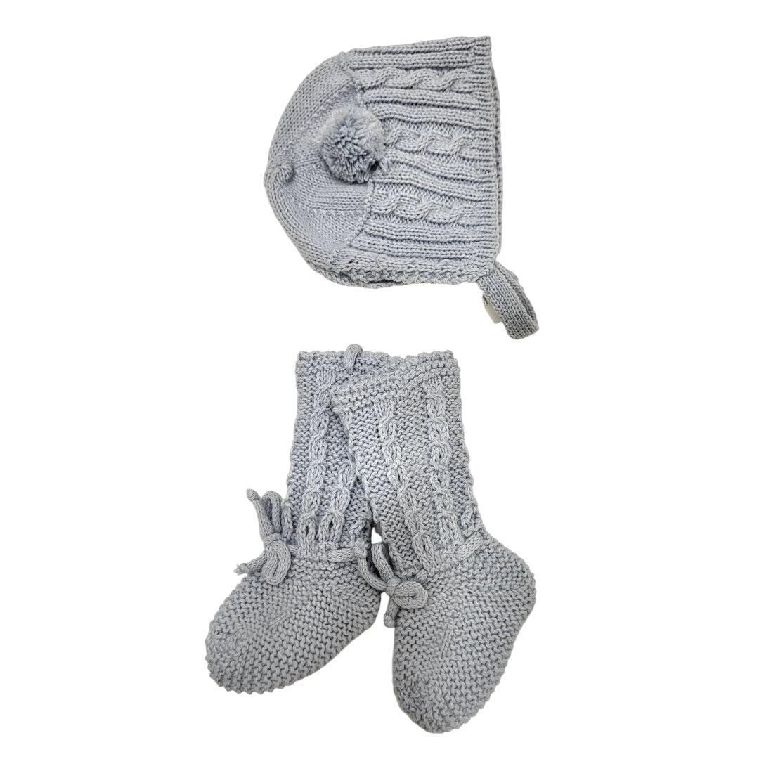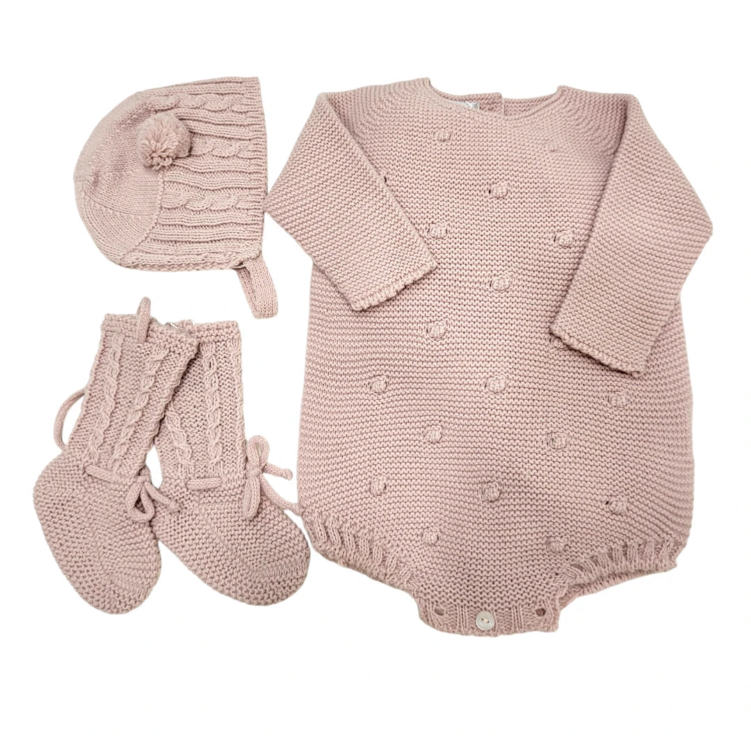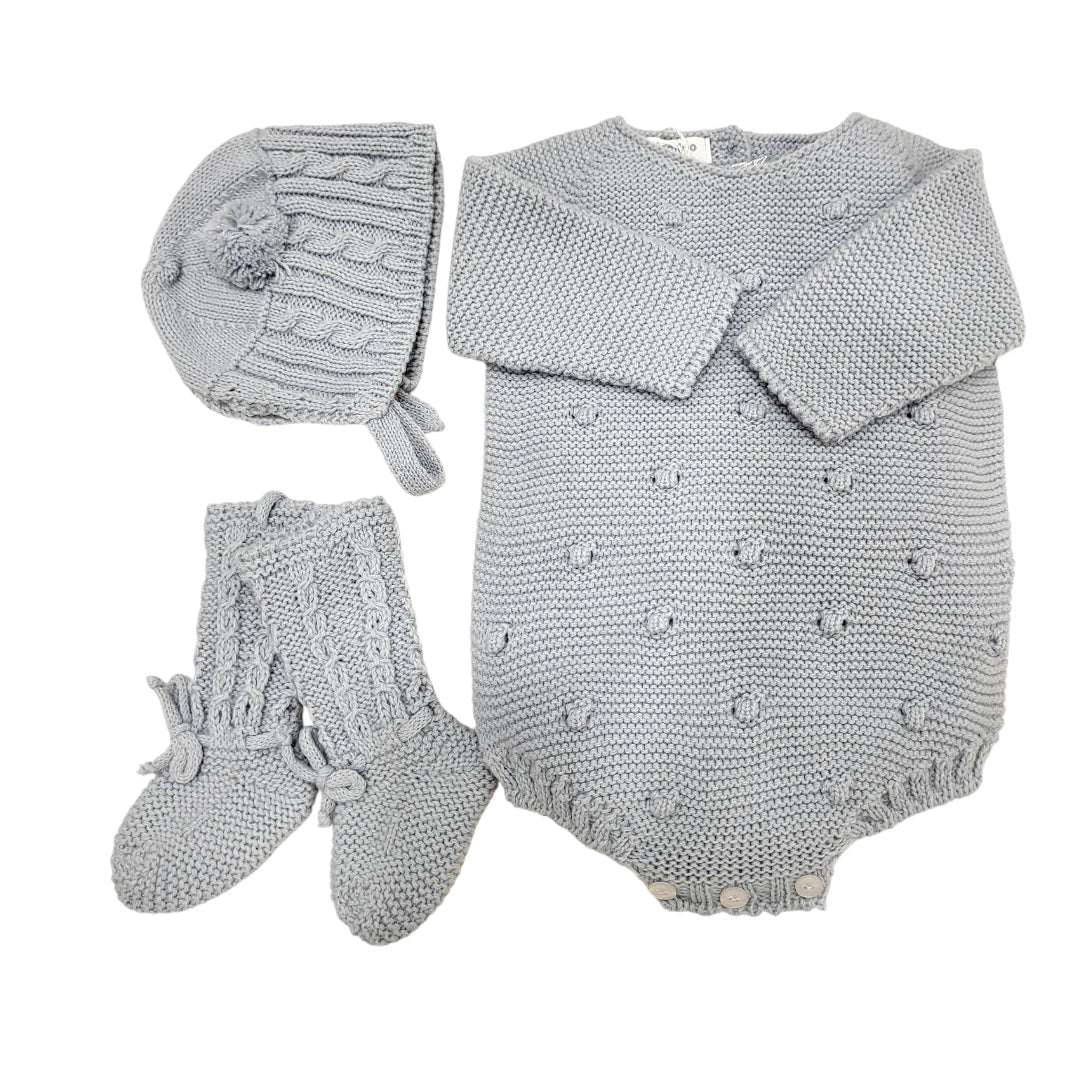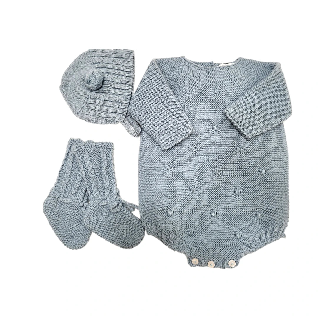Conjunto de 3 piezas pelele de punto, capota y patucos altos "Capri". Disponible en cuatro colores.
