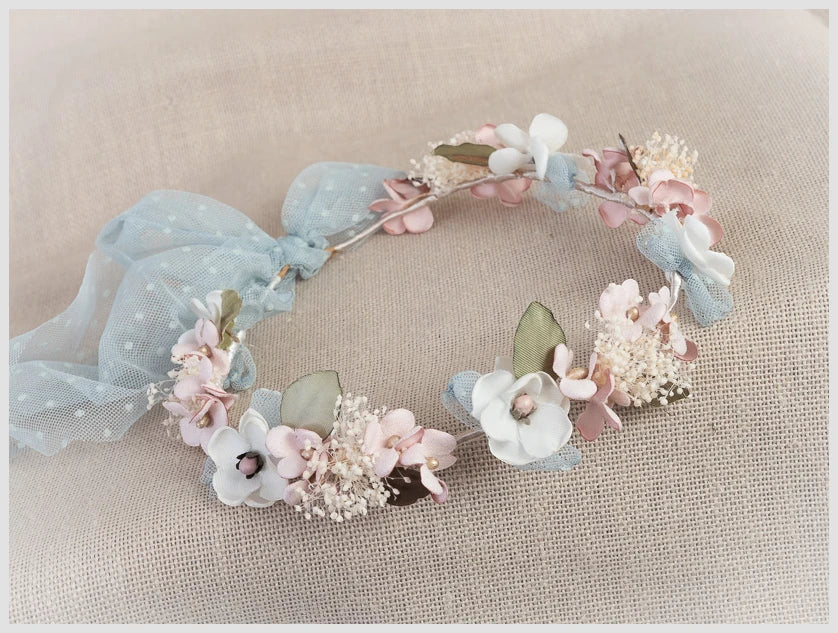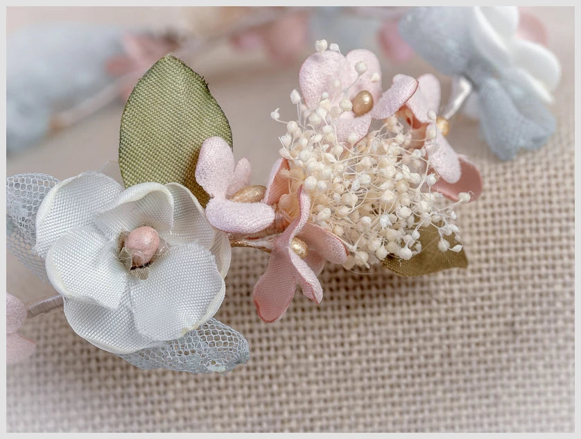 Corona muy delicada en tonos pastel y pistilos dorados. Combina bonitas flores en tonos rosa palo y flor pasiflora con detalles en tul verde, consiguiendo un acabado muy dulce.