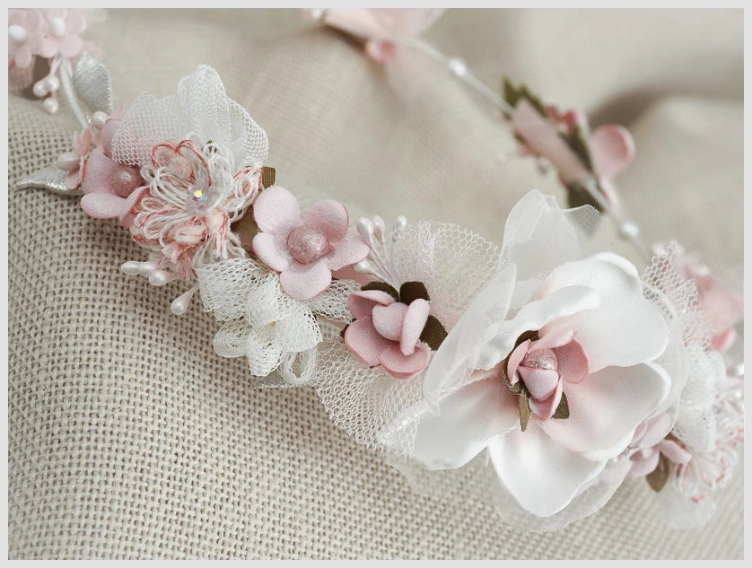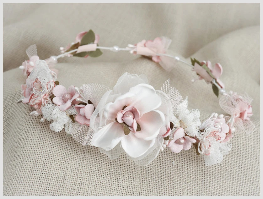 Corona contemporánea de tamaño asimétrico, mediano por la parte delantera y más ancha en la parte de atrás. Combina bonitas flores en tonos rosa palo y blanco con detalles en tul, consiguiendo un acabado muy estiloso.