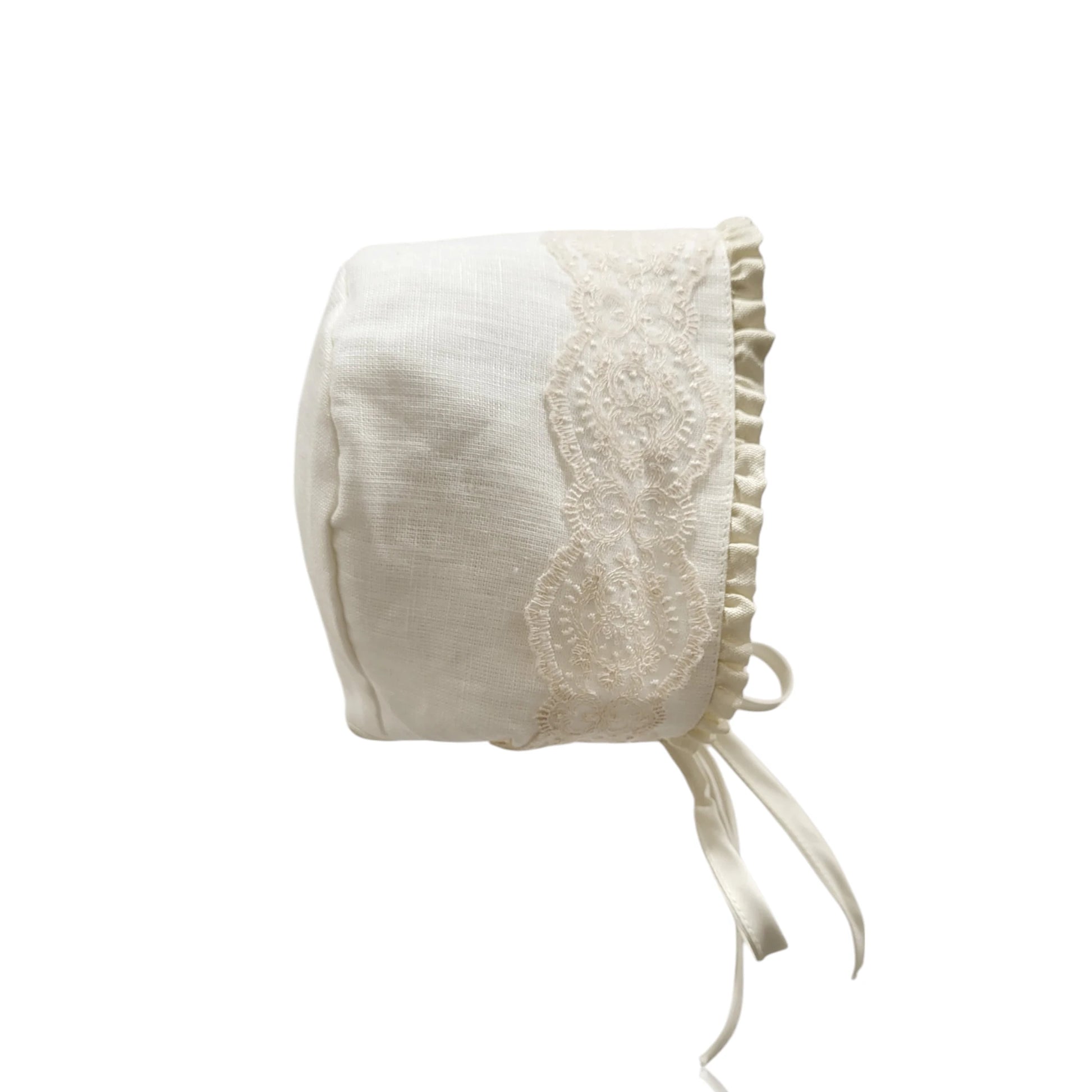 Incluye una capota a juego, confeccionada con el mismo lino y detalles de puntilla, para un conjunto armonioso y encantador.