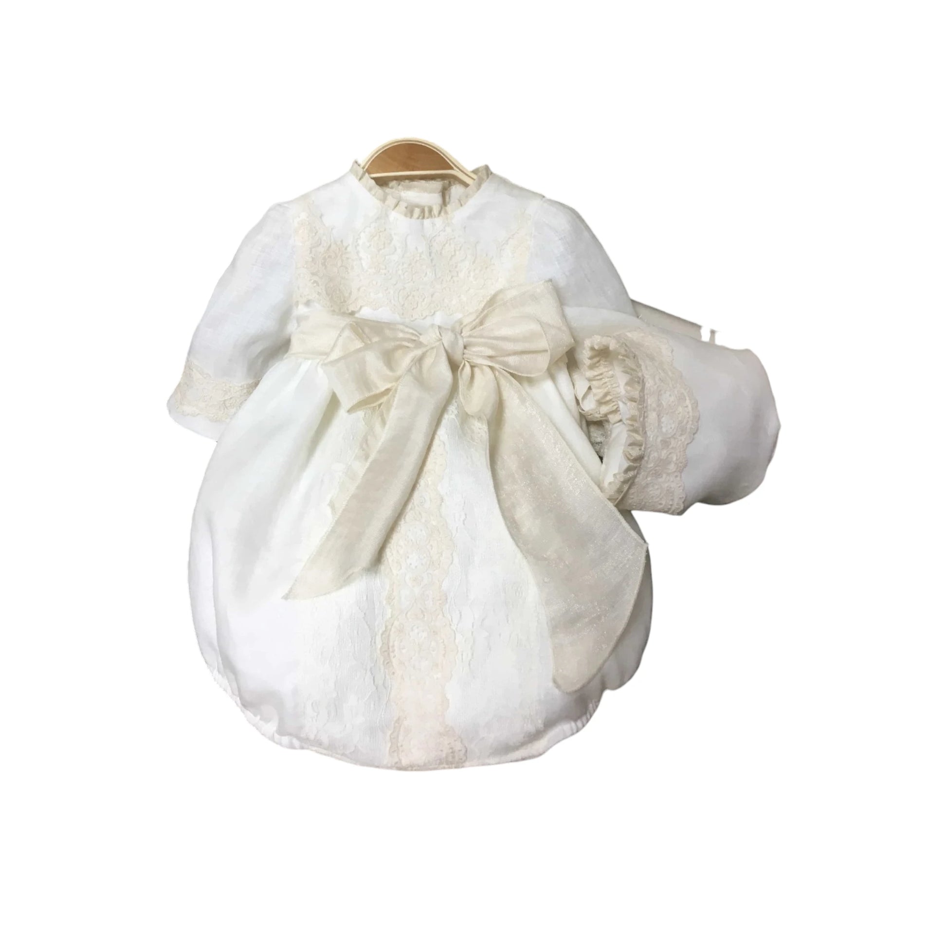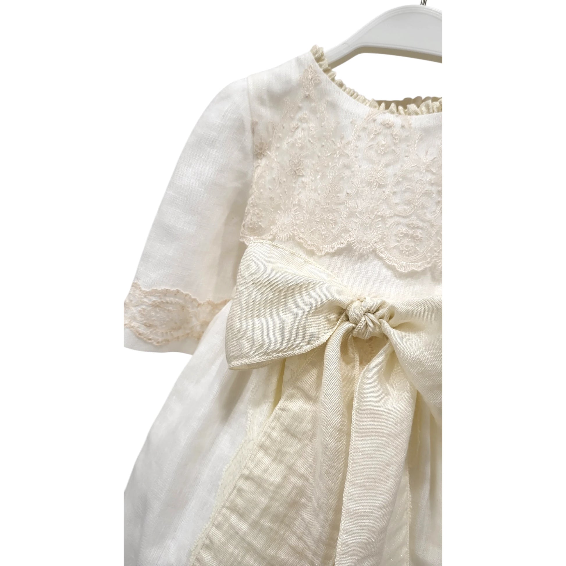 Pelele de hilo acabado con cuello redondo y manga al codo. Detalle lazo vistoso en color beige subido haciendo un bonito contraste. Confeccionado en lino de alta calidad, este conjunto destaca por su suavidad, ideal para ceremonias en cualquier época del año. Interior forrado con tejido de batista.