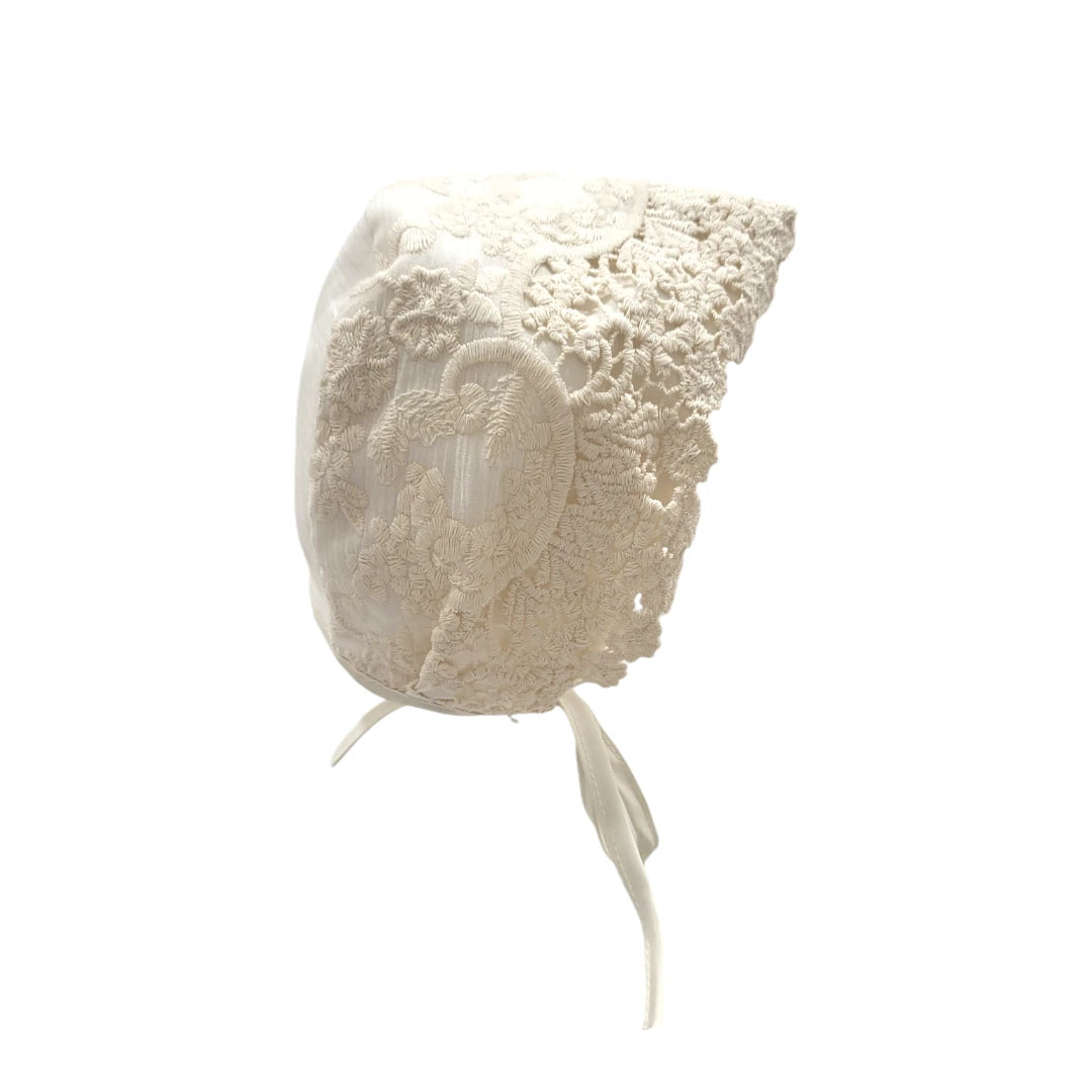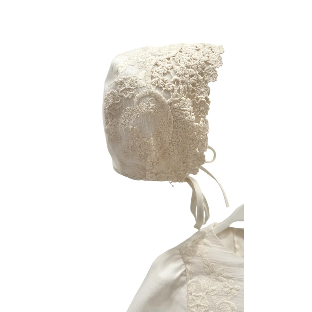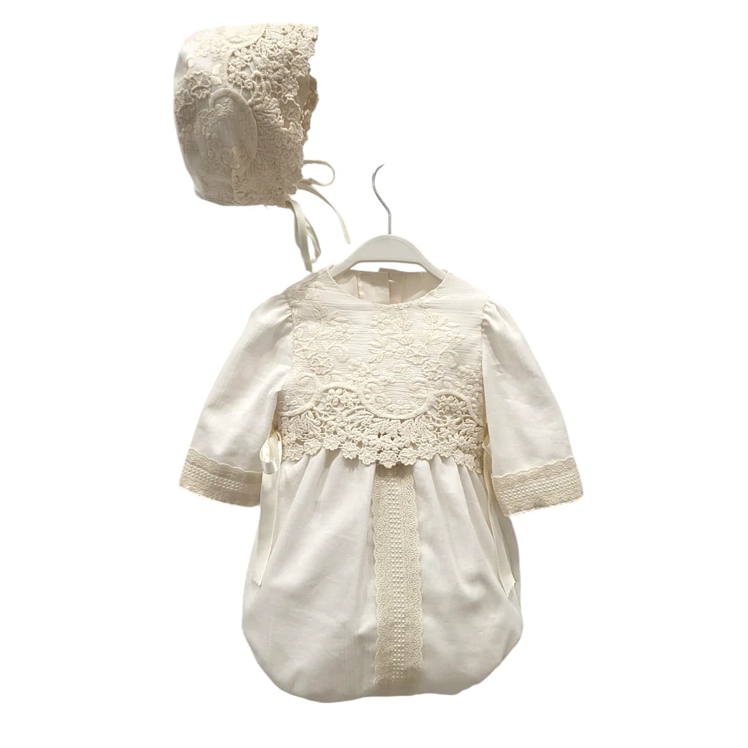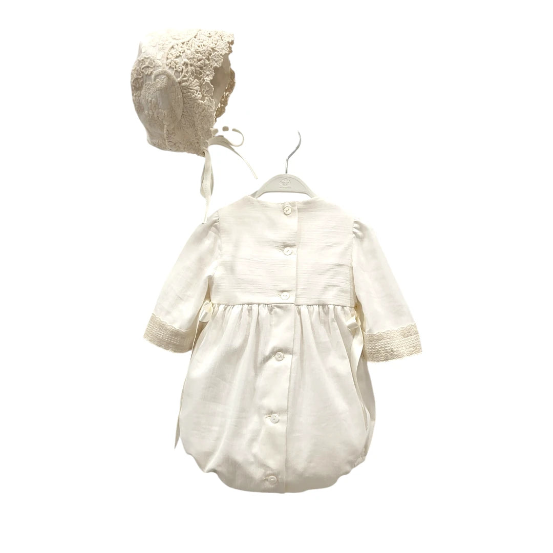 Pelele de bautizo con capota en tejido hilo y puntilla bolillo `Modelo Alma´