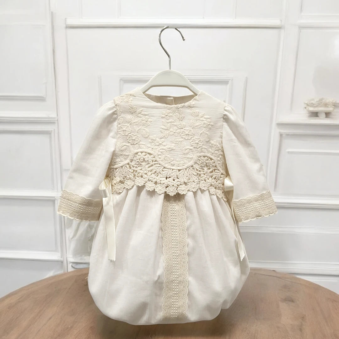 Su diseño elegante y refinado incorpora una exquisita puntilla de bolillo en el pecho combinada con bordados en tono beige, que aporta un toque de distinción y artesanía. Las mangas al codo realzan su elegancia y permiten una movilidad cómoda para el bebé.