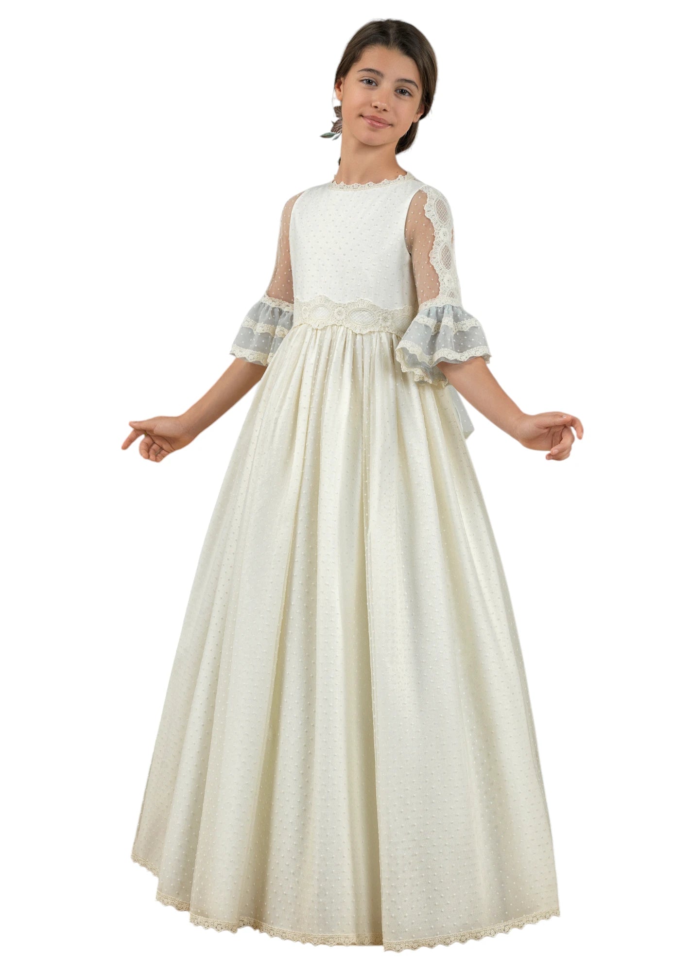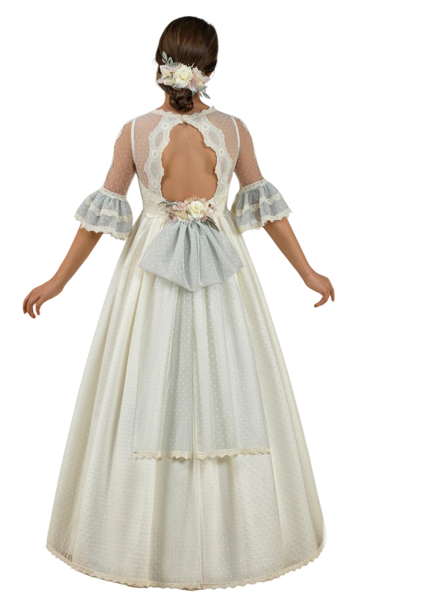 Elegante vestido de comunión confeccionado en un delicado tejido de tul plumeti flocado marfil con fondo color verde agua en fajín y volantes de la manga. Este diseño de corte alto destaca por su manga al codo con vistoso volante doble y una espectacular espalda abierta que realza la sofisticación del conjunto. Posibilidad de confeccionar espalda cerrada o en pico sin coste añadido, consultar información detallada respecto a este cambio.