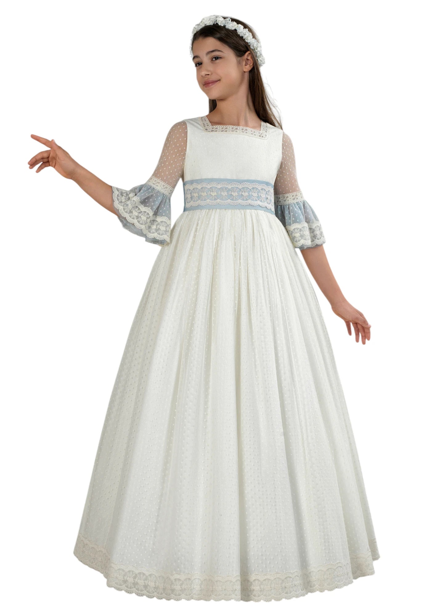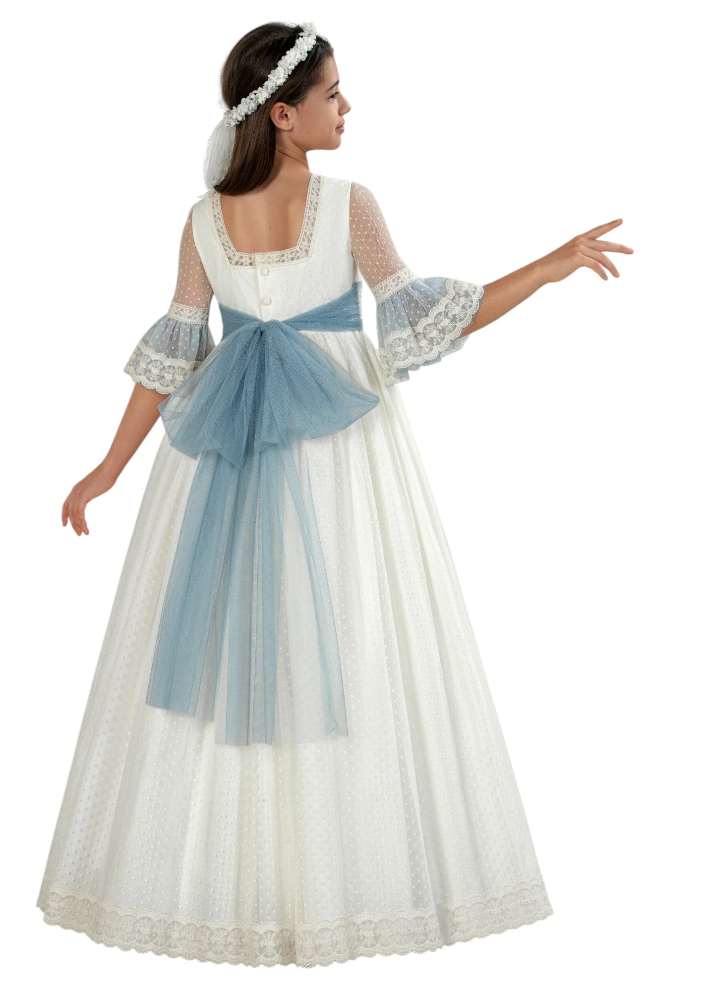 Elegante vestido de comunión confeccionado en un delicado tejido plumeti que aporta un toque romántico y atemporal. Este diseño de corte alto destaca por su manga al codo con vistoso volante y una espectacular espalda abierta que realza la sofisticación del conjunto.