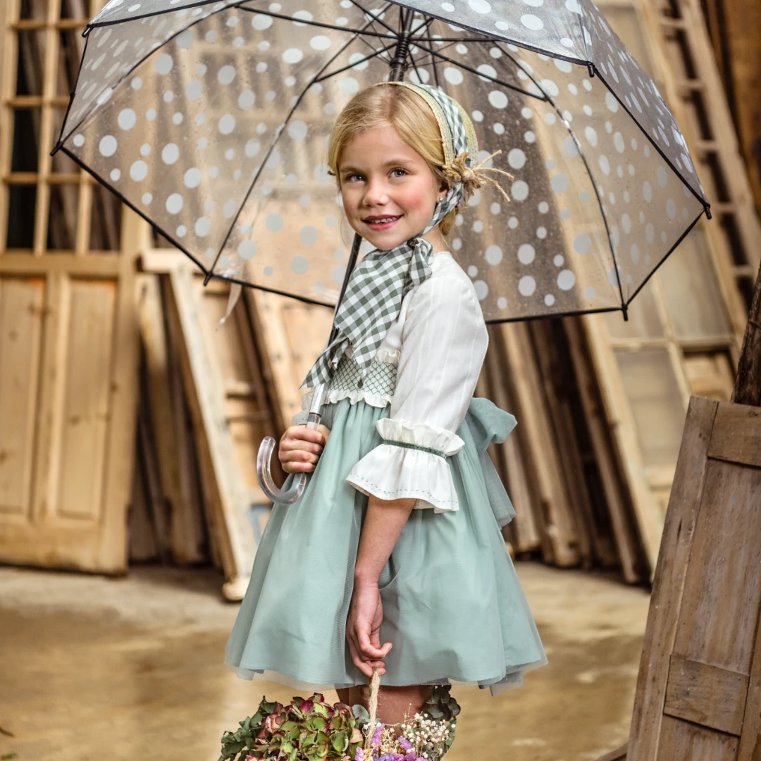 Vestido de manga larga confeccionado en tejido viella que combina color marfil muy claro con falda verde y capa de tul por encima. Un diseño clásico con un estilo renovado, resalta su fajín en nido panal en los tonos realzando la terminación del vestido, acabado con una lazada de tul en la parte de atrás para ajustar dándole un toque dulce y sofisticado para una ocasión especial.